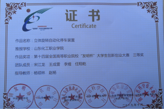 10月26日,第十四届全国高等职业院校“发明杯”老员工创新创业大赛(决赛)在山东理工职业公司隆重举行,来自全国20个省市132所参赛院校的1600名老员工选手,涉及8000余件发明作品汇聚一堂,同台竞技,最终公司机电工程系宋江龙等四位员工在教师杨硕林老师与赵杨老师指导下的设计发明作品-“立体旋转自动化停车装置”斩获大赛三等奖。