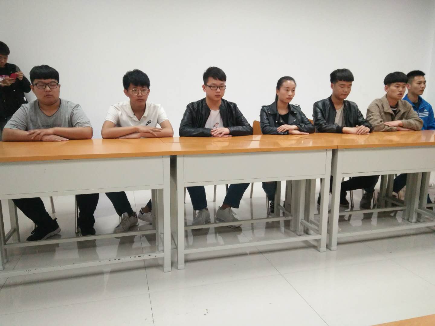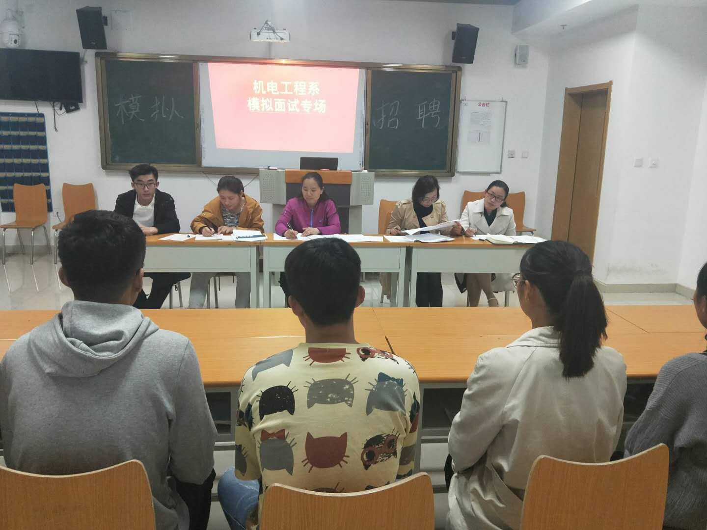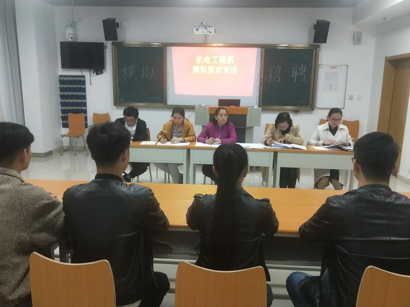 机电工程系主任彭爱玲、专业课教师张亚楠、孙亚茹以及机械专业辅导员朱怀红四位担任模拟面试考官,另外还有一名已经成功就业的员工代表侯安梁。